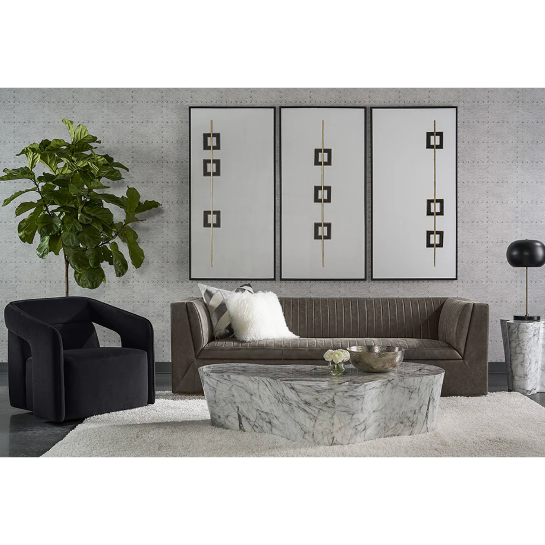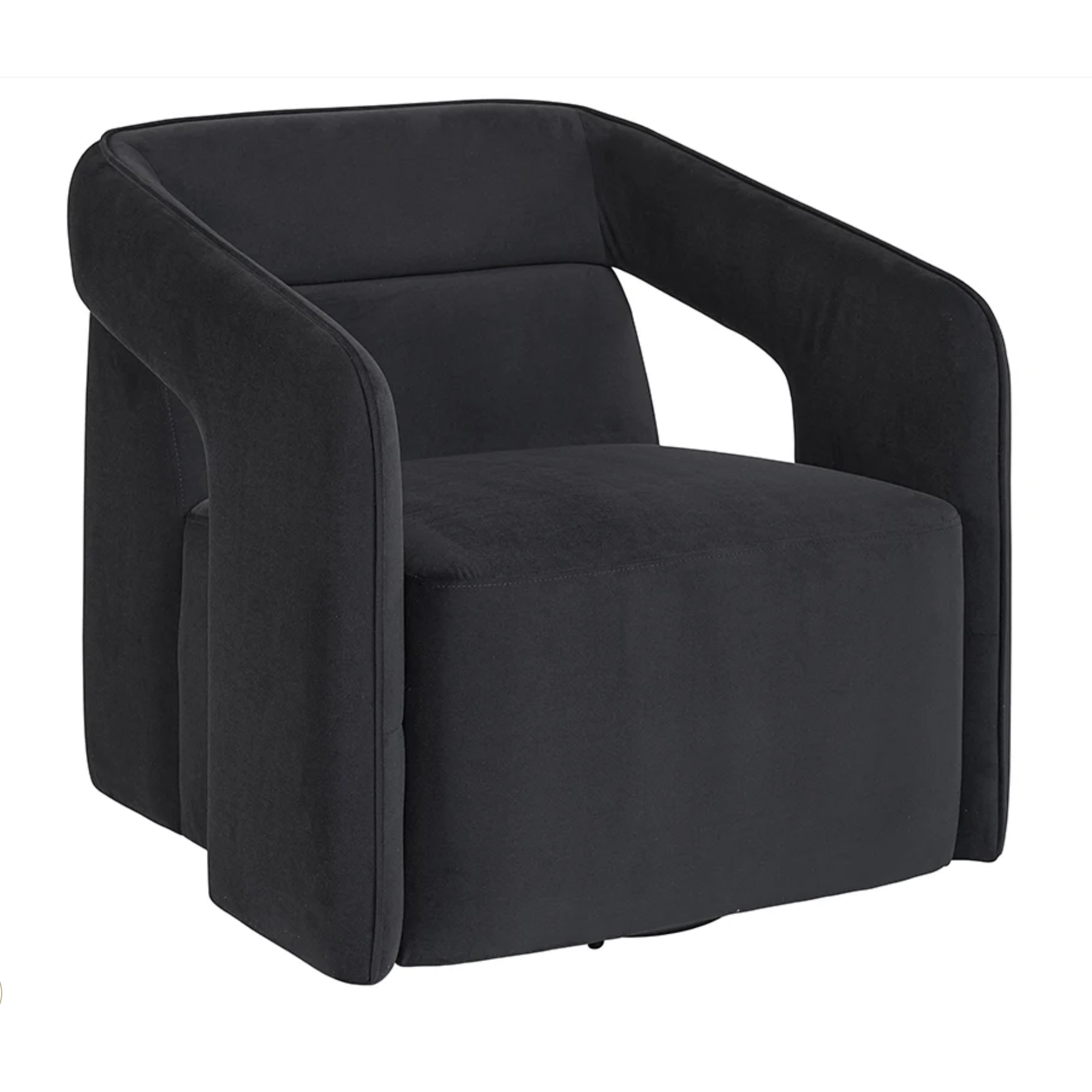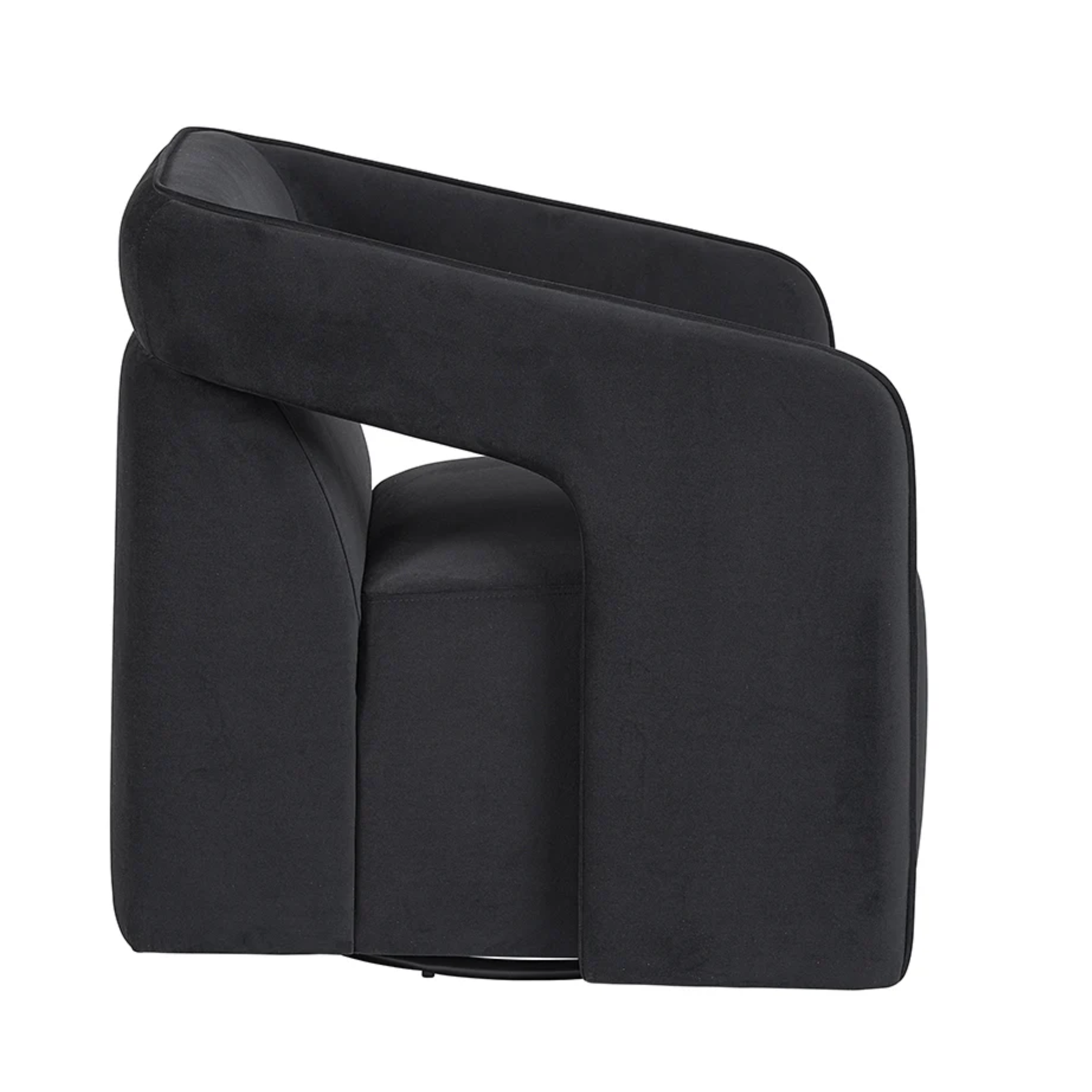 A futuristic swivel chair featuring cut out arms and a large, comfortable seat in abbington black.
