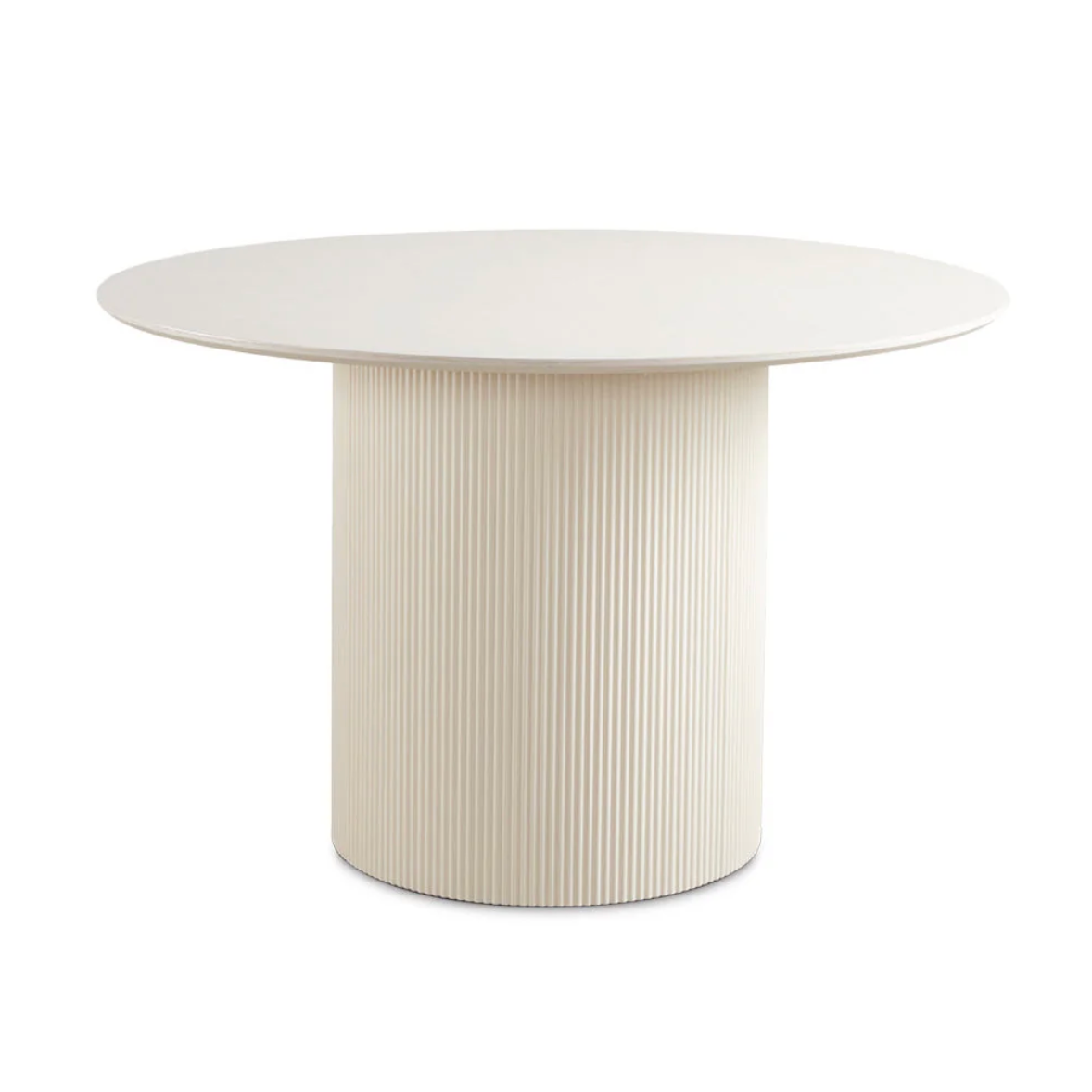 Featuring a smooth, round tabletop paired with a sculptural fluted base, this piece creates a soft yet striking silhouette. The all-white finish enhances its clean aesthetic, making it a versatile centerpiece that complements both contemporary and classic interiors.