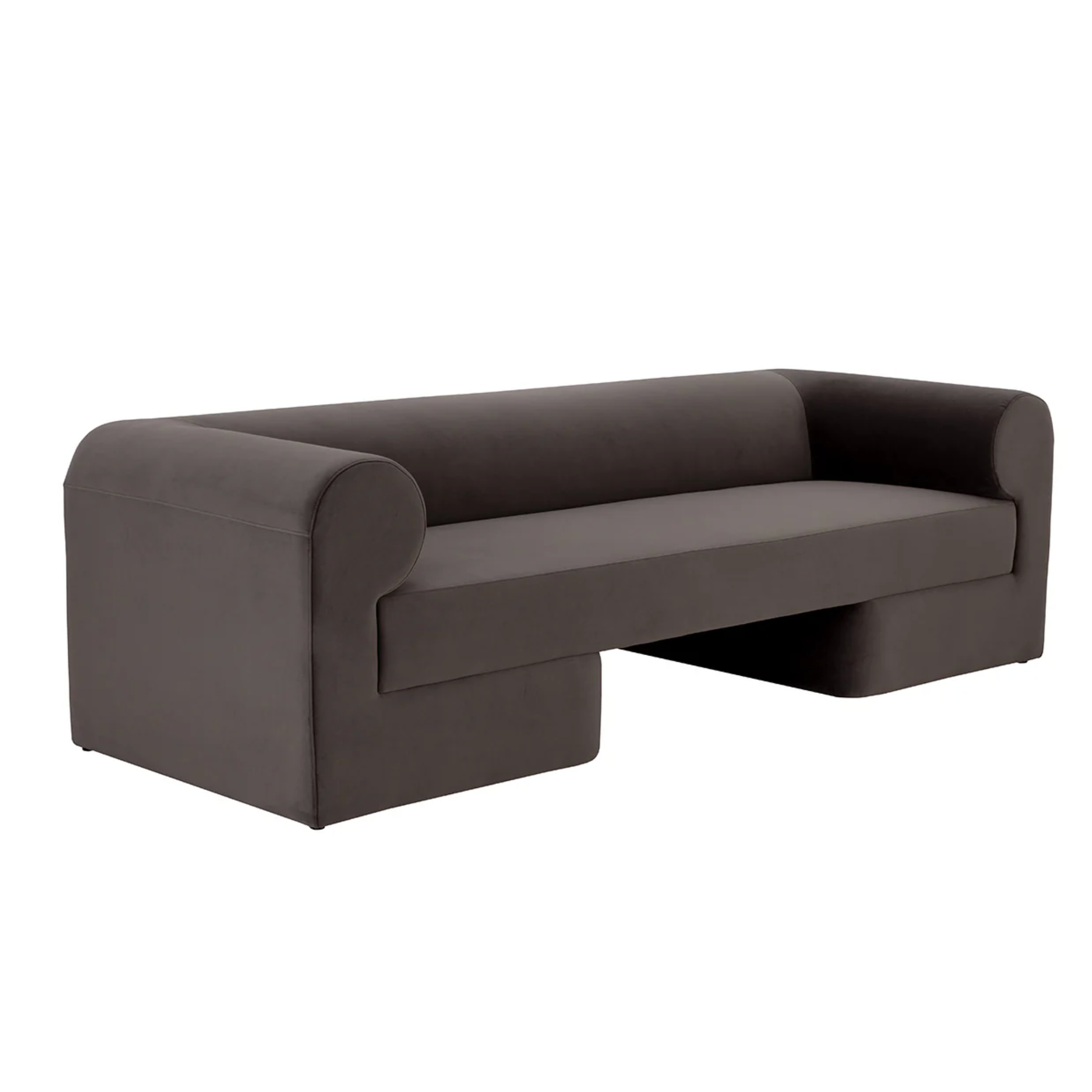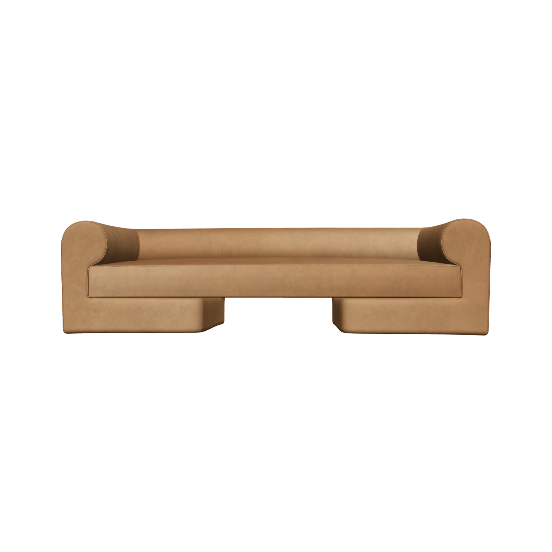 A bold take on contemporary style, this sofa will stand out in any space. Features rounded back and arm rests for ultimate comfort. Fully upholstered in luxurious meg taupe and gold fabrics. Pair with coordinating armchair to complete the look.