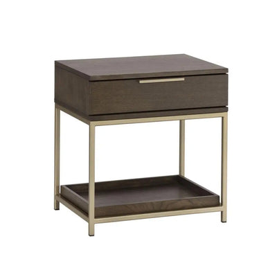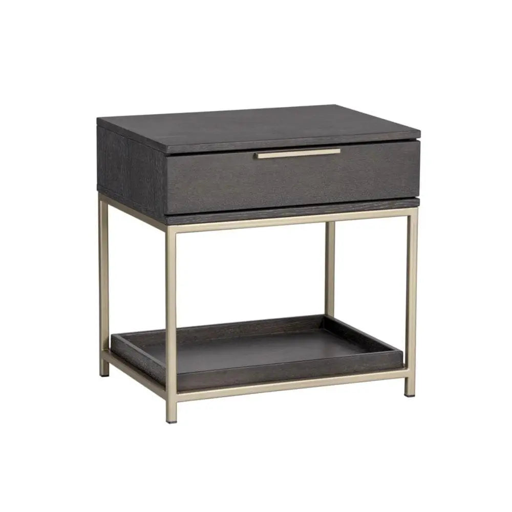 A modern nightstand designed to add a beautiful touch to the bedroom. Crafted from charcoal grey oak veneer with a soft closing drawer and shelf for added storage. Brushed gold iron hardware completes the look. As wood is an organic, porous material, these pieces will contain natural variation of texture and may also exhibit fine indentations and cracks. Wood pieces will also display a disparity of colour and grain, and visible knots and burls that add to the character of each piece.