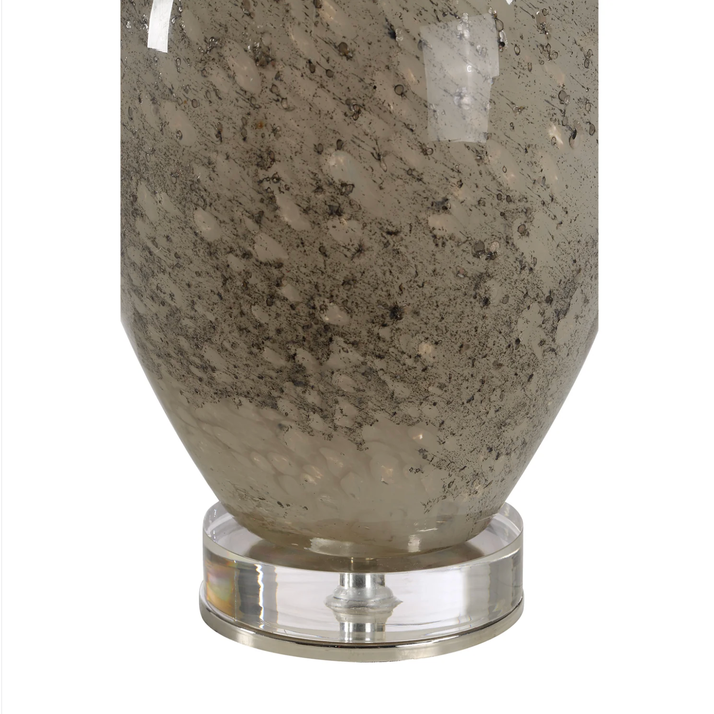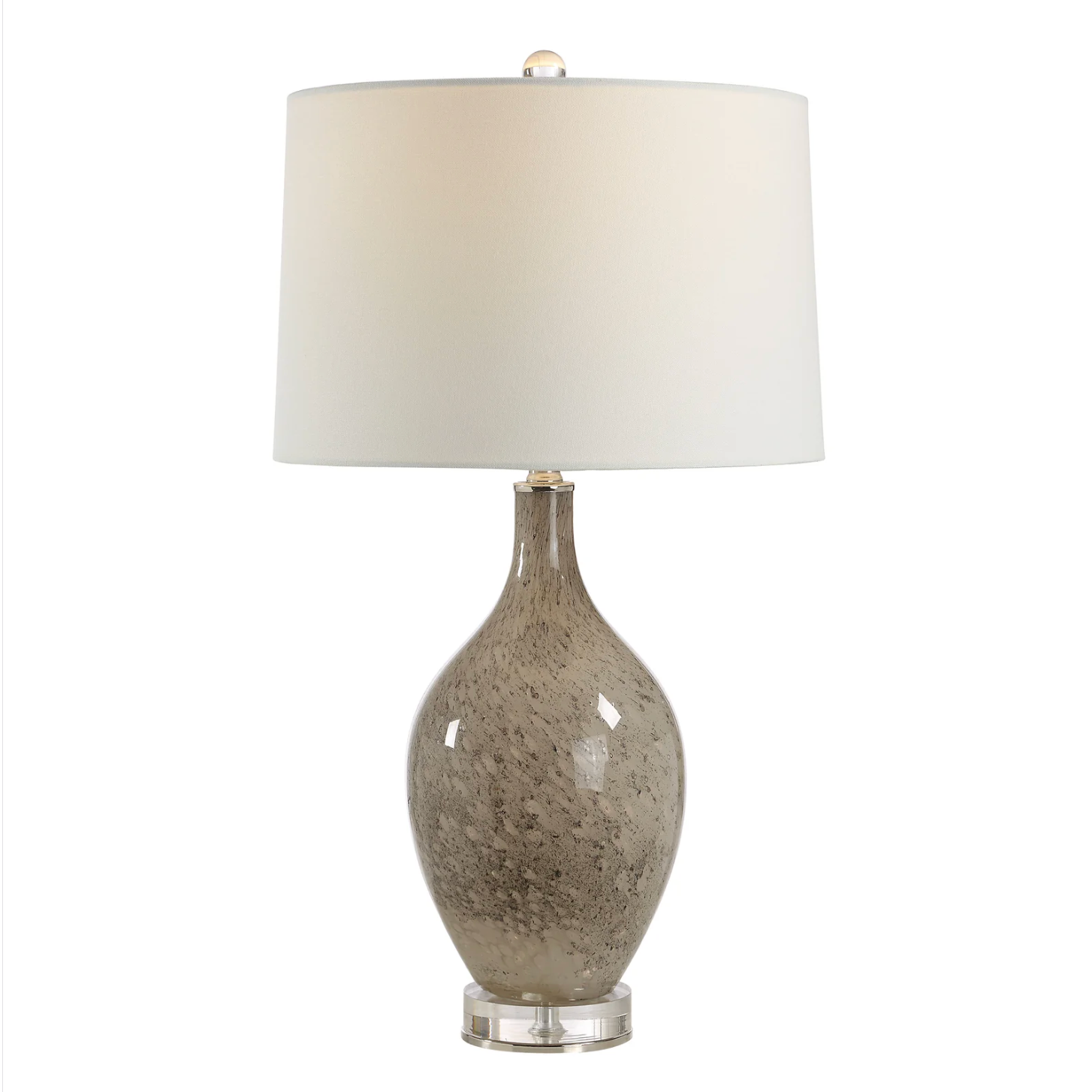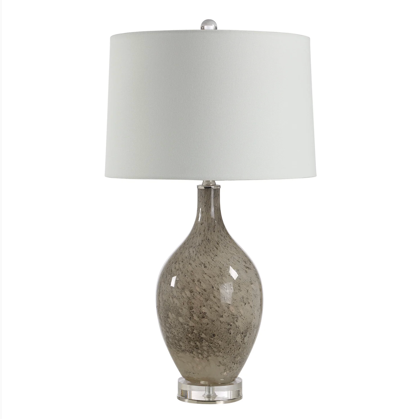 Shiny and curvy, this stylish table lamp will create a striking focal point anywhere it sits. Accented with polished nickel and clear accents, its green glass body holds an off-white drum shade for a soft glow and high-contrast style. One or a pair will update any space with ease.